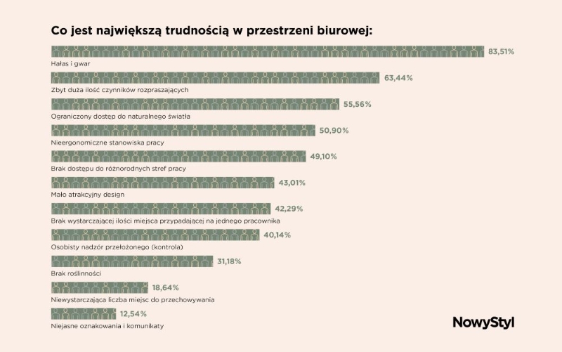 Wyniki badań1 przeprowadzonych przez Nowy Styl – lidera kompleksowych rozwiązań meblowych dla przestrzeni biurowych i miejsc użyteczności publicznej – wskazują na główne problemy w przestrzeniach biurowych. Najważniejsze to hałas i gwar, na który wskazuje aż 83,51% badanych. Następne w kolejności są: zbyt duża ilość czynników rozpraszających (63,44%), ograniczony dostęp do naturalnego światła (55,56%), nieergonomiczne stanowiska pracy (50,90%), brak dostępu do różnorodnych stref pracy (49,10%), mało atrakcyjny design (43,01%), brak wystarczającej ilości miejsca przypadającej na jednego pracownika (42,29%), osobisty nadzór przełożonego i kontrola (40,14%), brak roślinności (31,18%), niewystarczająca liczba miejsc do przechowywania (18,64%) oraz niejasne oznakowania i komunikaty (12,54%).